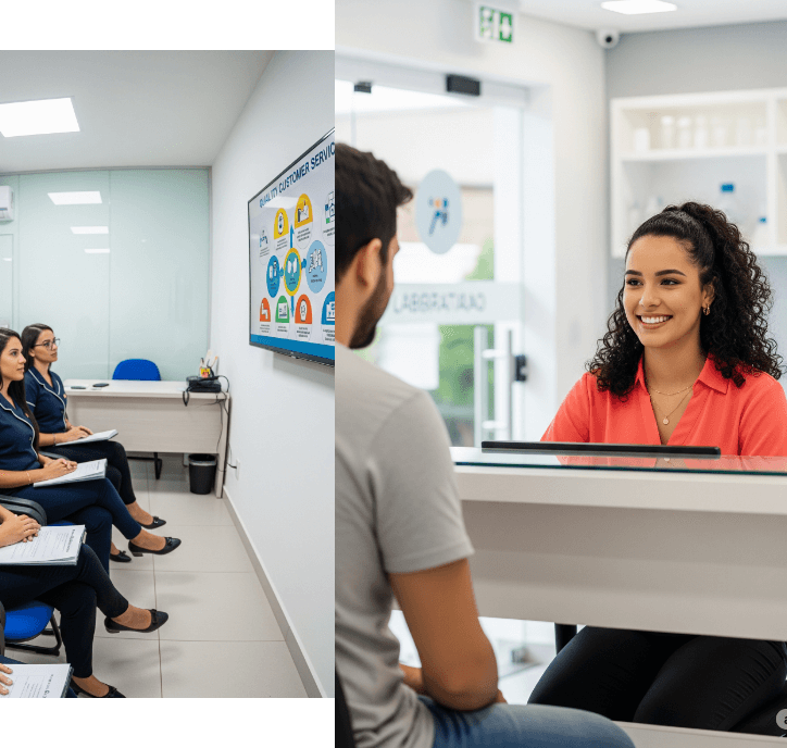 Nossa atuação começa no desenvolvimento do ativo mais valioso do laboratório: as pessoas. Treinamos e capacitamos sua equipe para atuar de forma comercial no atendimento presencial, digital e telefônico, transformando oportunidades em vendas e faturamento.